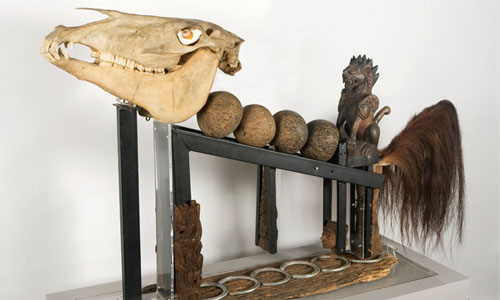 Mohammad Din Mohammad (Malaysia 1955 – Singapore 2007) Besides man's physical journey, it is also a spiritual quest. Singa Kuda mirrors the human imagination and the experience that represent an inward journey. Mohammad's sculptures and paintings are assemblages of found objects he collected and transformed. An exponent on Malay mystic beliefs and practices, his works are expressions of his spiritual worldview in which the objects he assembled are the separation of the body and soul. He expressed the need to unite their separated dimensions into an art form intended as symbolic codes. Animal bones, hair, coconuts, horseshoes are some of the objects used to incorporate the versatility and aesthetics of his works. Each work reveals his inner journeys and his quest for the universal aspect of existence. Singa Kuda simulates a horse astride, while the lion figurine that sits at the tail end is the rider. The work can be read as a metaphor for the spiritual journey where both vehicle and rider represent an integrated duality, a united whole, a spiritual quest that unites mankind. As a traditional healer, and a teacher of silat martial arts, his works act as extensions for healing. Mohammad din graduated from the Nanyang Academy of Fine Arts with a diploma in fine arts in 1976. Apart from being an artist, he was also a tabib or traditional healer, and a teacher of silat martial arts. |