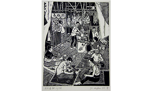 Lim Mue Hue (b.1936 – 2008) The late Singapore born Lim Mu Hue was trained in western painting at the Nanyang Academy of Fine Arts. Along with his contemporaries, Lim taught at the Academy and was influenced by the Woodcut Movement in China. His prints often reflect socio-political themes depicting daily life of ordinary Chinese and portraying the beautiful atmosphere of their local villages. Working with a variety of mediums from oils, ink to woodcuts and charcoal, his works are strongly grounded in the Singaporean lifestyle and Chinese symbolism reflecting his Chinese identity. Backstage of a Puppet Theatre is a work by Lim Mu Hue who emerged in the 1960s along with his contemporaries Lim Yew Kuan and Choo Keng Kwang as artists working in the woodblock medium engaging with the social realities of post-war Singapore. This particular work emerged from Lim Mu Hue's interest in Chinese performing arts. Lim goes backstage, extending the privilege of close encounter with street opera actors to viewers. The print is shown alongside its paper transfer to highlight embellishments that the artist made to his observation rendered on paper. Lim's interest in patterns and decorative embellishments elevate the social narrative to a loving work with much anecdotal charm. |