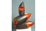 Portrait reminds the viewer of missiles, in this case each precariously stacked above the other. Two wide angular slits on the uppermost piece resemble the human mouth, parted in speech. |