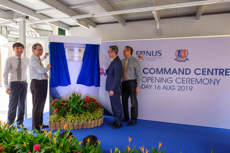 NUS President Professor Tan Eng Chye and Senior Vice President (Campus Infrastructure) Professor Yong Kwet Yew unveiling the new OCS Command Centre plaque
