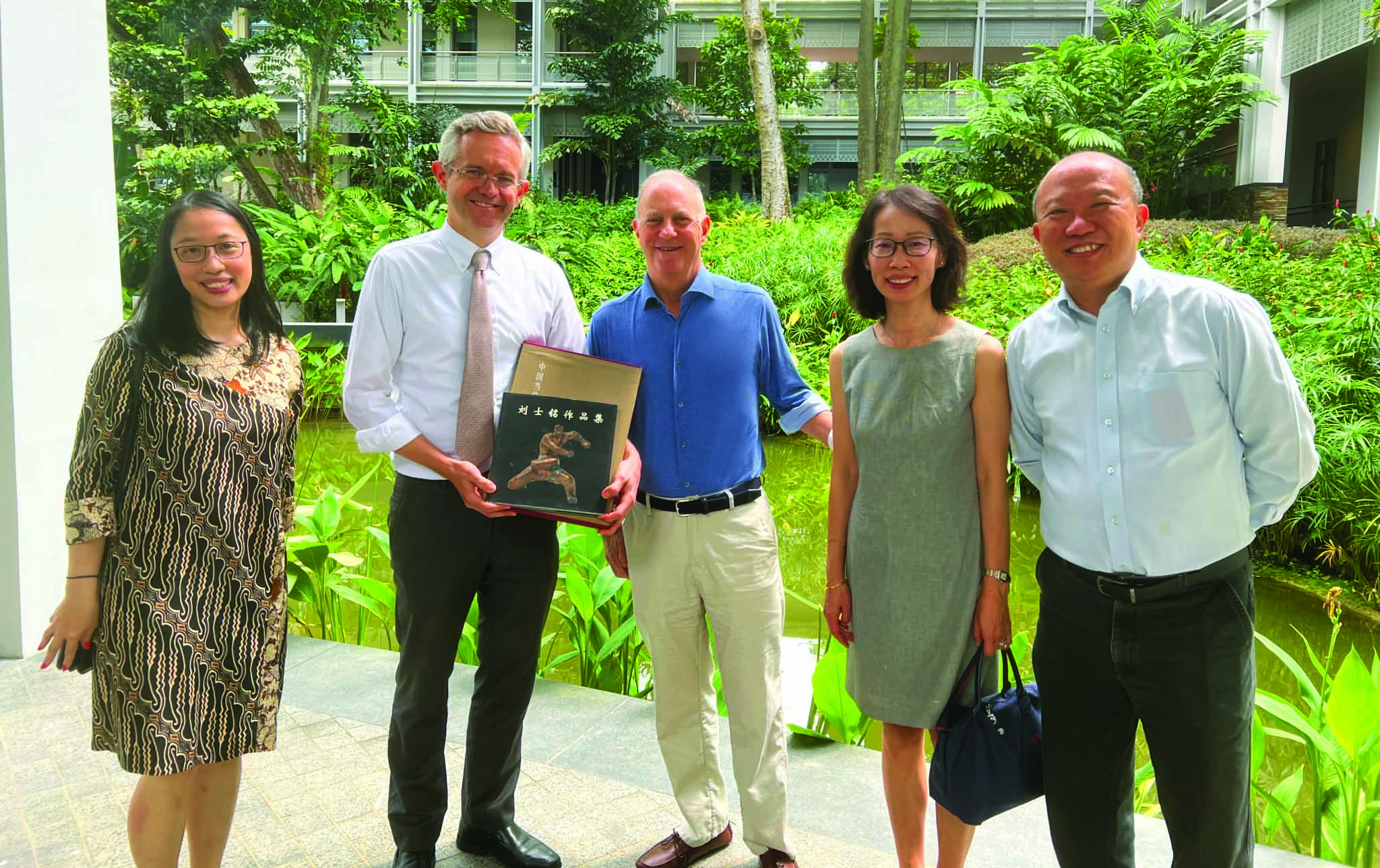 Left to right: Rachel Phoon (Head of Development, NUS College), Professor Simon Chesterman (Dean, NUS College), Andy Serwer (Co-chair of the Advisory Board, Liu Shiming Art Foundation), Puiking Hui (Director of External Affairs, Liu Shiming Art Foundation) & Victor Koh (friend of NUS College and Foundation)Andy Serwer and Puiking Hui of the Liu Shi Ming Art Foundation presenting books compiling Liu Shi Ming’s art pieces to Prof Simon Chesterman, symbolising the inspiration of interdisciplinarity placed upon NUS College.