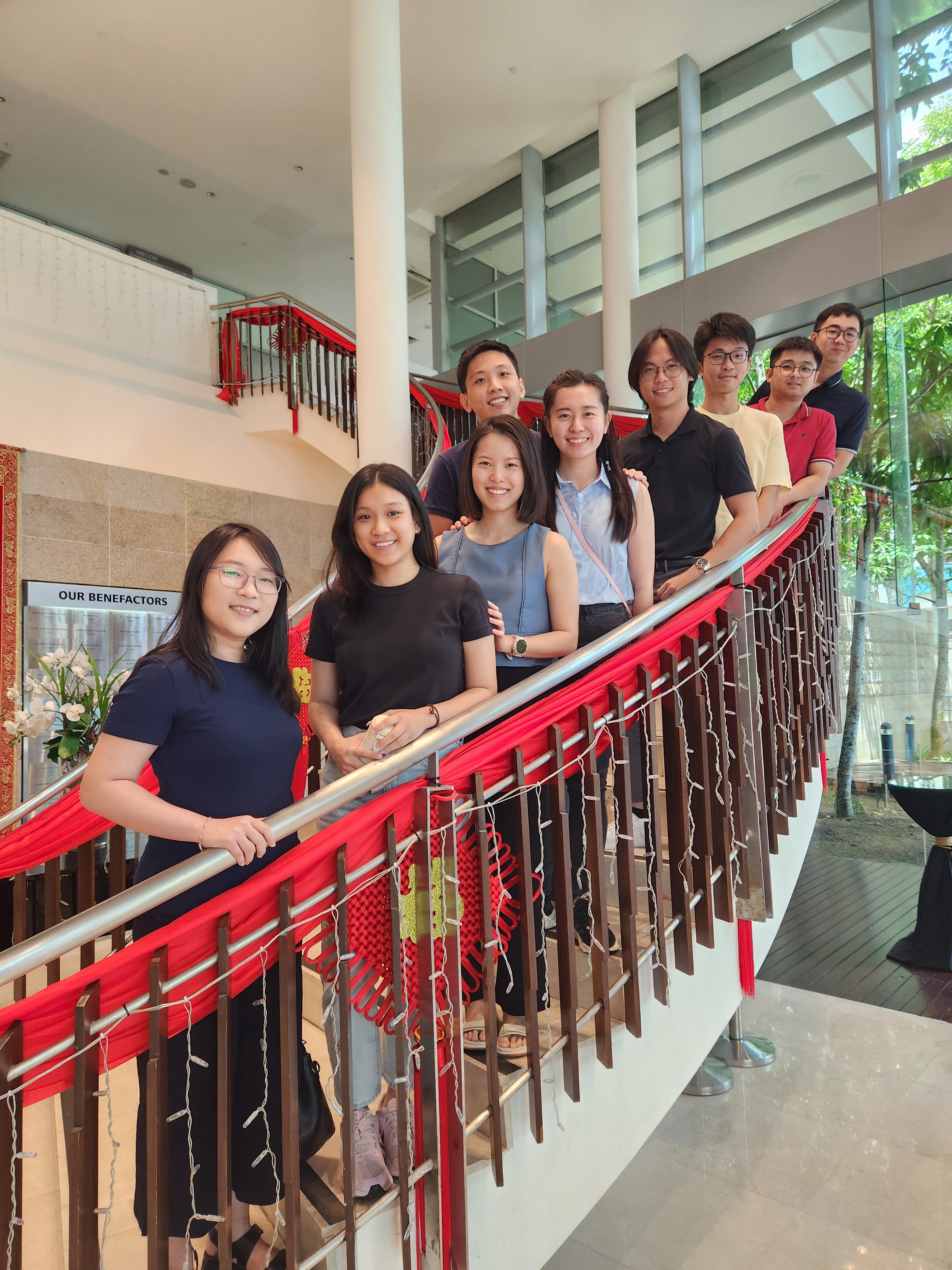 Ms Tan Ke Yin (centre in light blue shirt) and Mr Lau Jing Xuan (behind her in navy blue shirt) with their junior scholars
