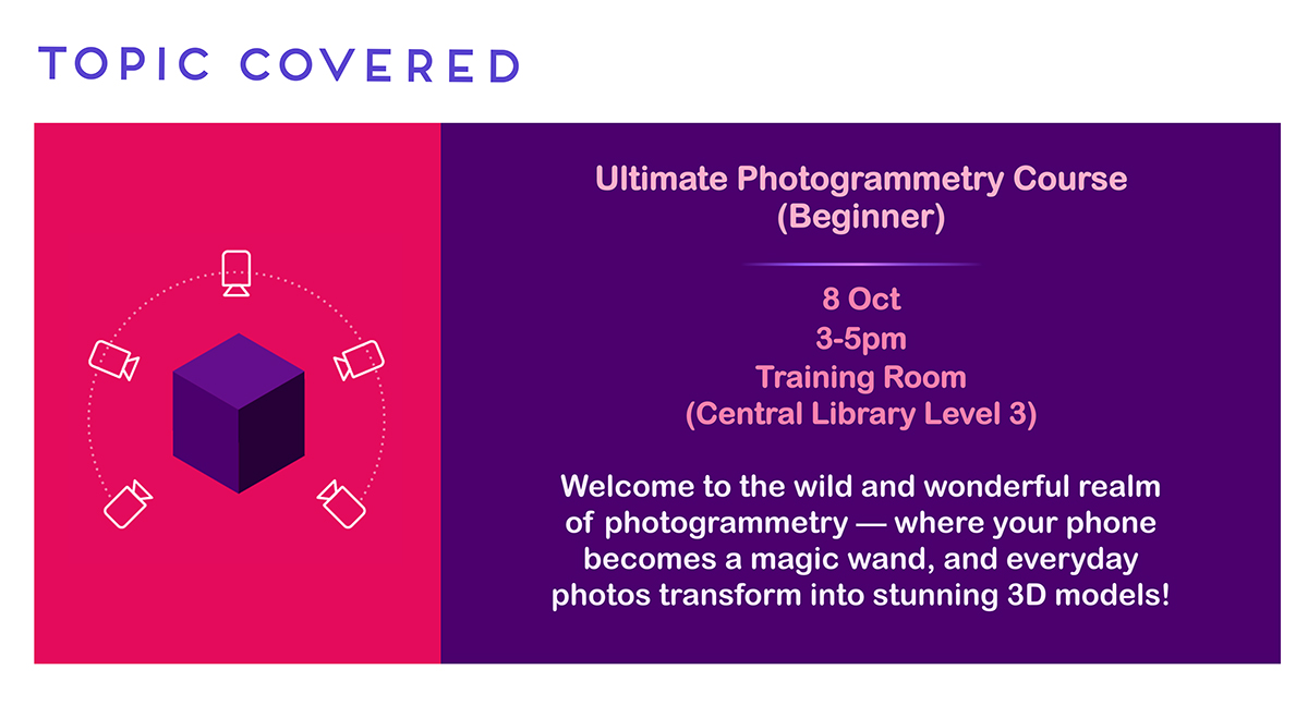 Sessions are typically conducted at the Digital Scholarship Lab, Central Library Level 4.