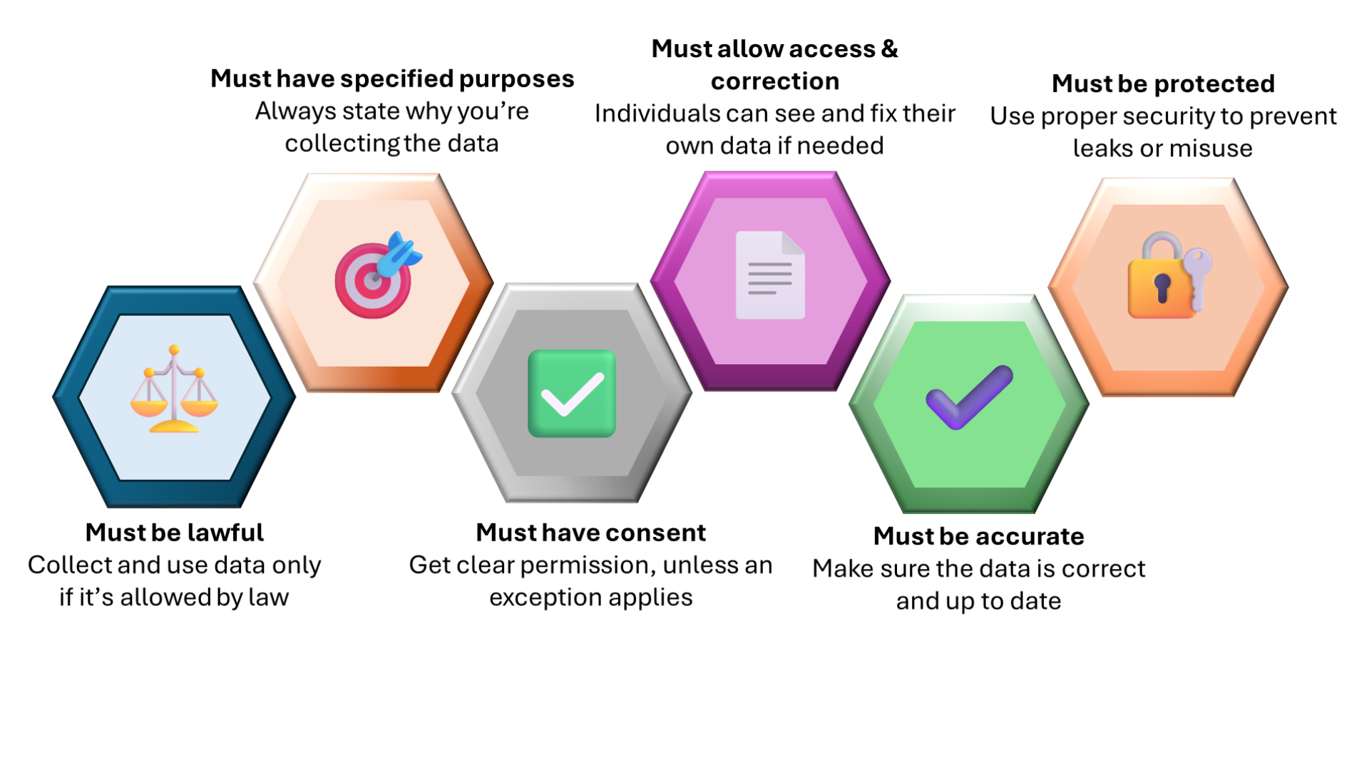 | 3 | Who will the personal data be shared with? | Always obtain consent from the participants for disclosing the collected personal data to third parties, e.g including the phrase “disclosing my personal data to third parties (including any third party located outside of Singapore)” in the disclaimer statement. When a third party is involved, transfer/sharing of personal data must be done according to the Data Highlights from the guidelines: 1. Contractual agreement with the third party should include clauses that cover confidentiality and 2. On an exceptional basis (i.e. when there is an absence of a contractual agreement and NDA), the 3. Obtain support from the Personal Data Protection Unit (PDP Unit) before sharing of personal data with 4. To share personal data with a third party electronically, encrypt the data before sending it out. | Sandy, an NUS staff member was planning an NUS Personal Data Protection Awareness workshop for NUS staff, NUS students and members of the public. To invite guest speakers who are experts in the data protection field, she partnered with a registered The online registration form was launched using “AAA booking”, an NUS approved third-party event Sandy discussed the data sharing matter with Madam Wong from Personal Data Protection Unit (PDP Unit) Here is the Consent Statement of the workshop: By submitting this form, I, as a participant of the NUS Data Protection Awareness Workshop consent to |  |