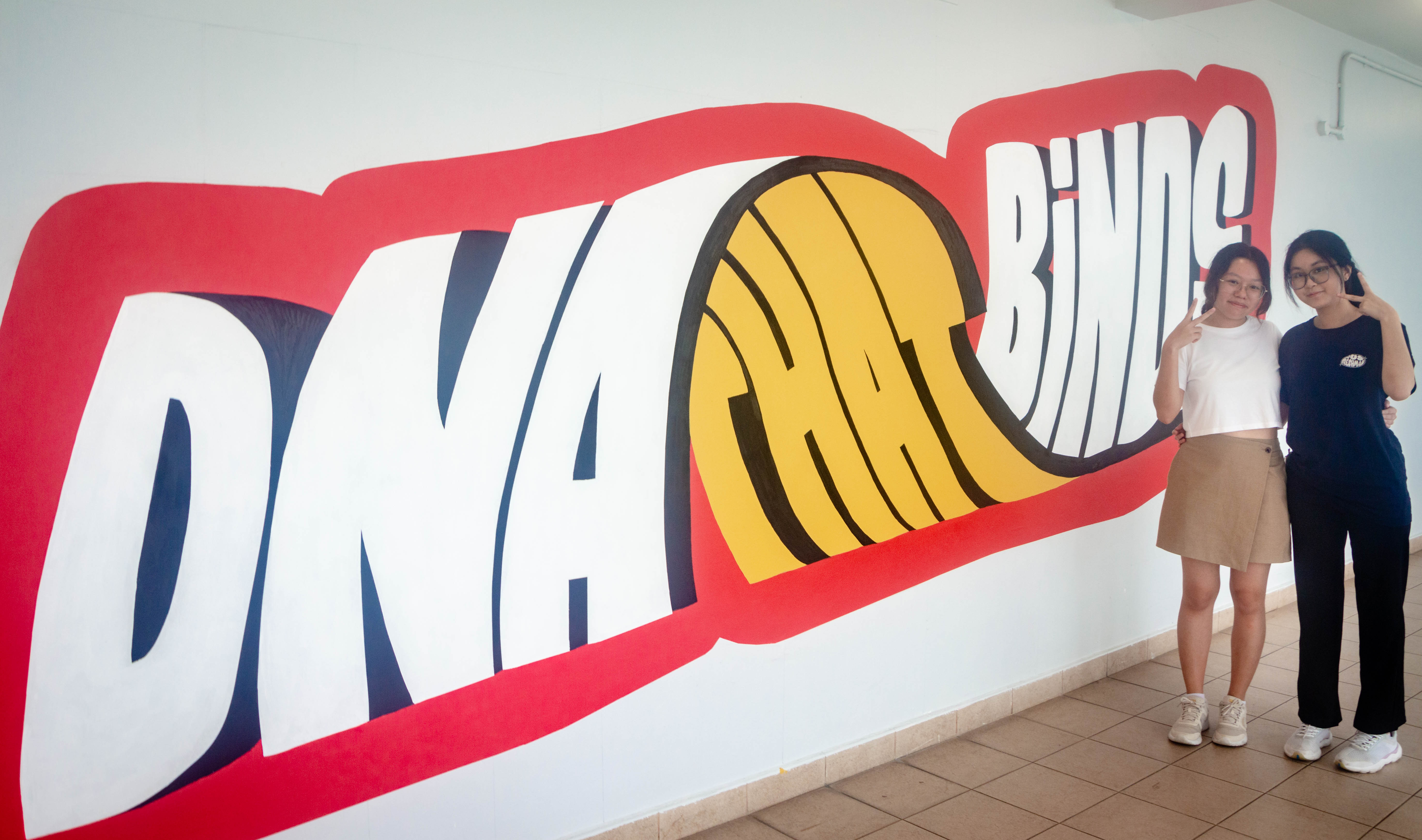 The second wall mural, which is inspired by Helix House’s tagline “DNA that binds”, has wave-like features that are reminiscent of the strands of DNA. Adopting a typographic design, the striking and bold mural serves as a complement to the illustrative features of the first mural design.