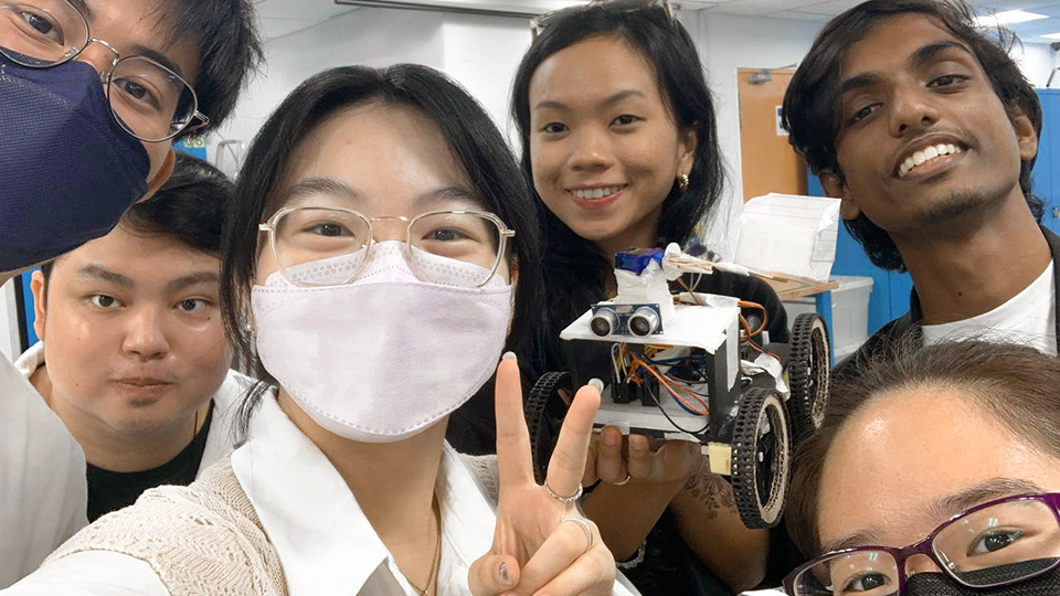 Azzah (back row, second from right), holding the robot that she made with her Design and Make project group teammates from the College of Design and Engineering.