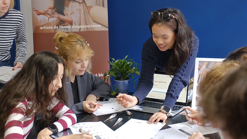 Azzah conducting a Henna workshop for her colleagues during her NUS Overseas Colleges Paris internship at Kovalee.