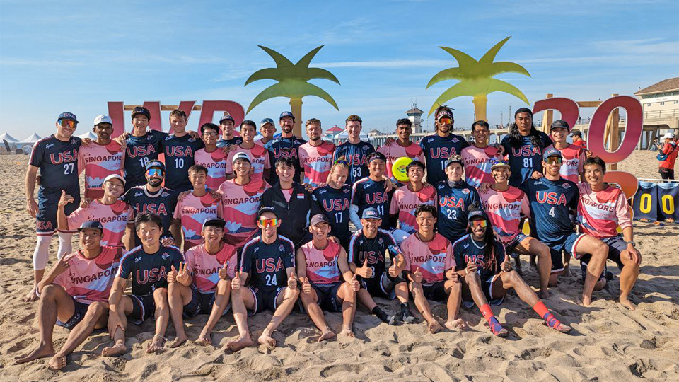Team Singapore (Zi Ang is fourth from left, second row) and Team USA at the 2023 World Beach Championships in California.