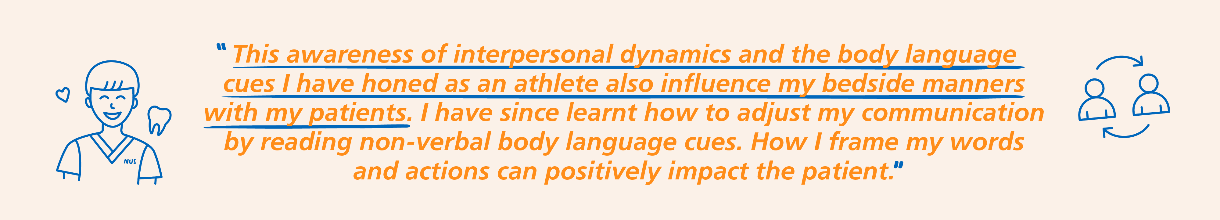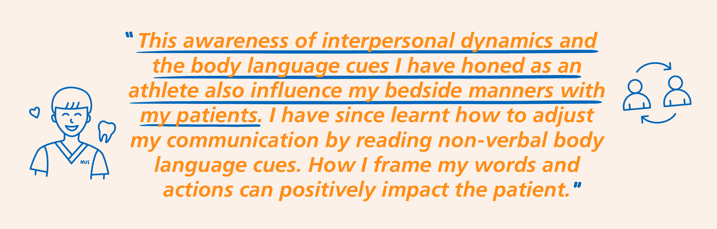 The sheer amount of time that Zi Ang spends on both passions — dentistry and frisbee — has deepened his appreciation of how these disciplines translate across the playing field and the dental chair. Their common denominators? The mental resilience to perform under pressure, as well as the empathy to understand others. “For both frisbee and dentistry, it is key to be mentally prepared for contingencies and stay calm under all circumstances,” he asserts.