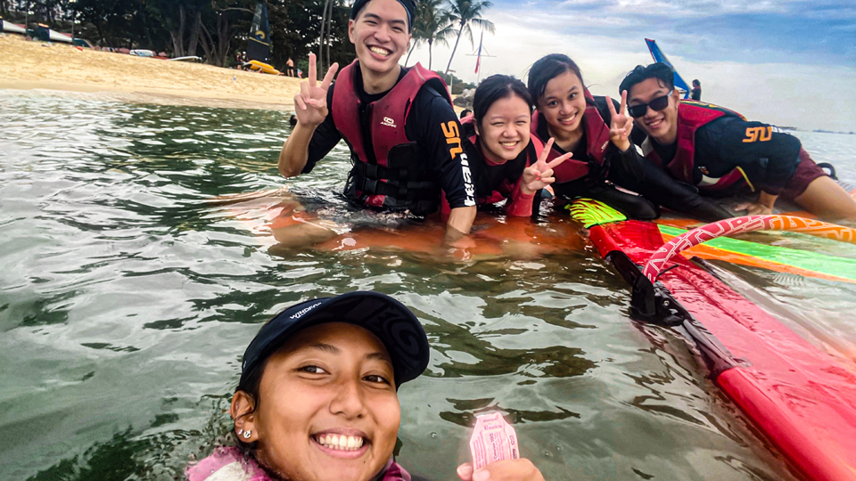 Marsha (bottom) sharing her love of windsurfing with fellow NUS students during the NUS Windsurfing taster session at the Aloha Sea Sports Centre in Singapore, where the students tried the sport for the first time.