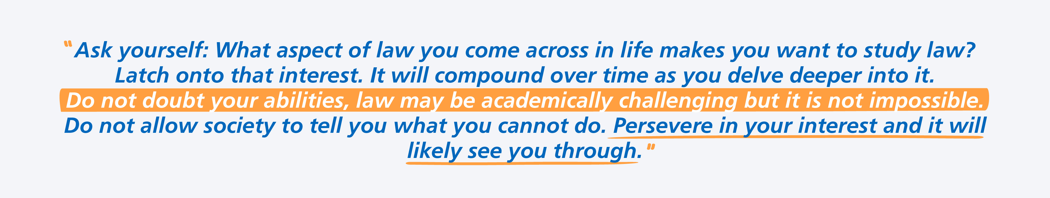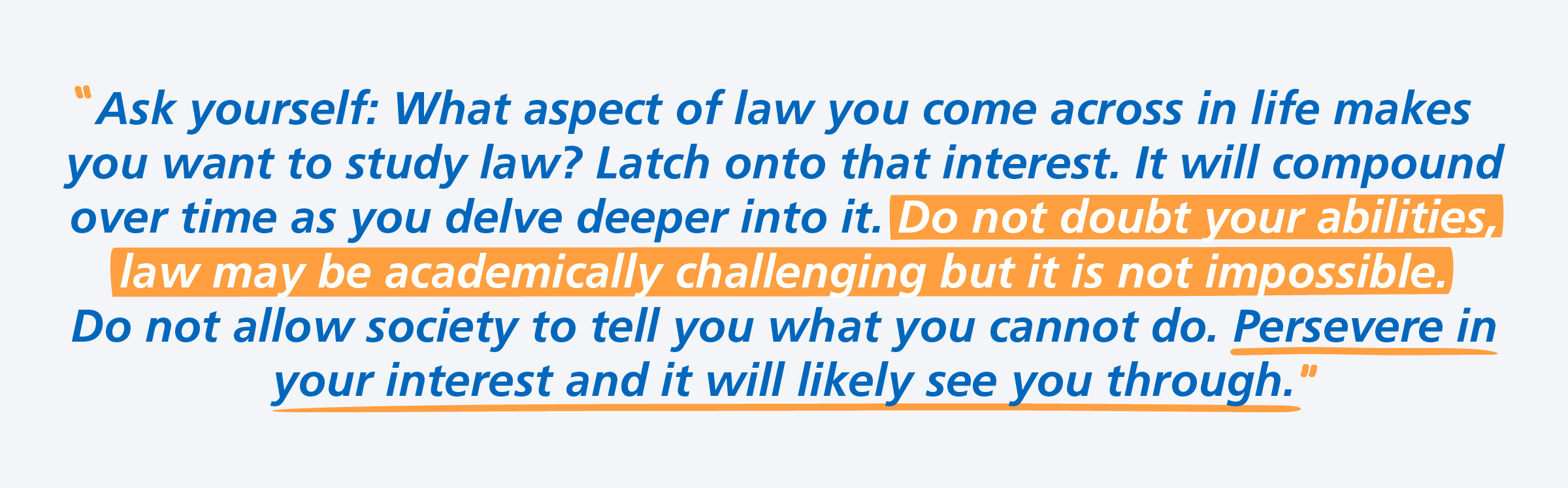 Yet when Marsha first started her first year in Law, it wasn’t exactly smooth sailing. Her grouse? The ornate language of law texts. The poetic phrasing did not intuitively resonate with the maths-lover who found it a struggle to engage with the readings. After years of exposure to such texts, she has learnt a few tricks to help her engage with the material: “I scan the keywords first before zooming in to specific things in my reading and have now become a more efficient reader and speaker as well,” she beams with satisfaction.