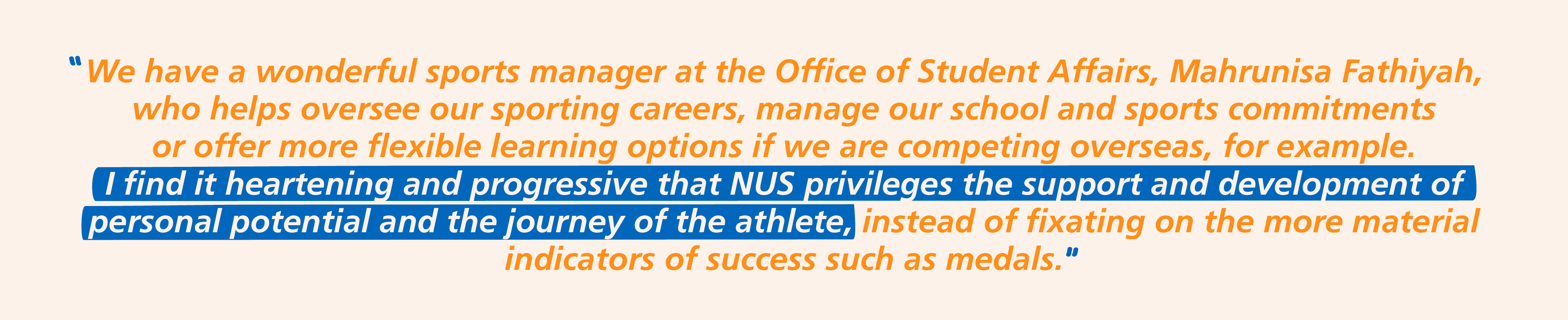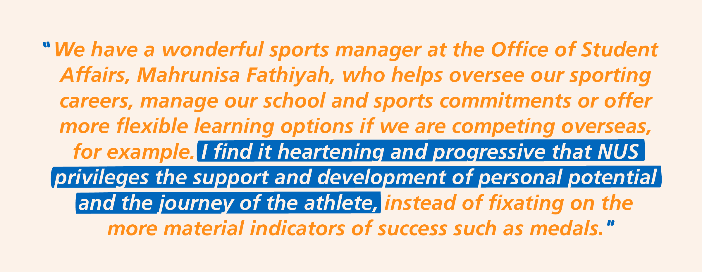 As an NUS Sports Scholarship recipient, Marsha not only enjoys generous living and accommodation allowances but is also given robust support in all aspects of her development as an athlete.