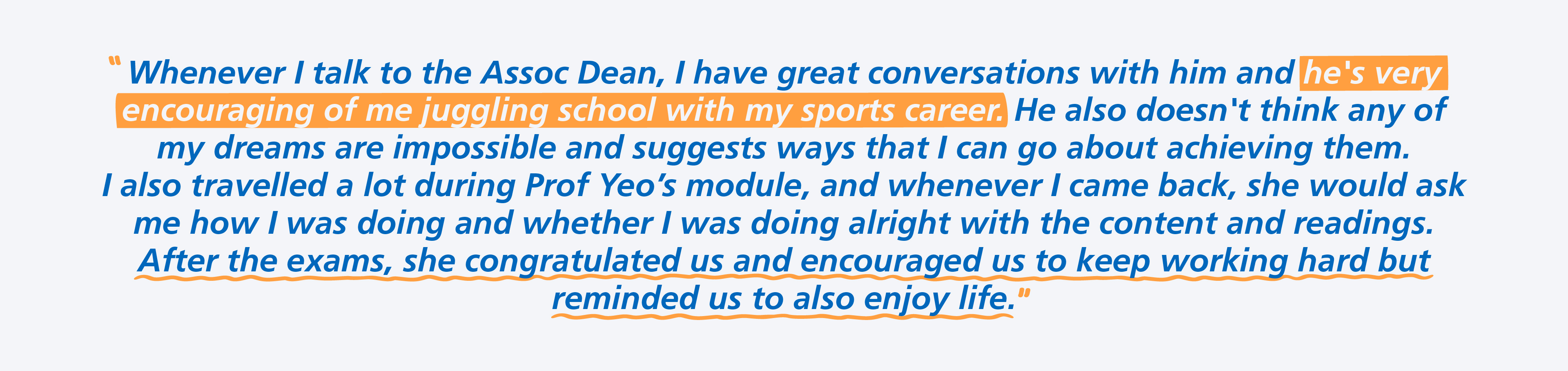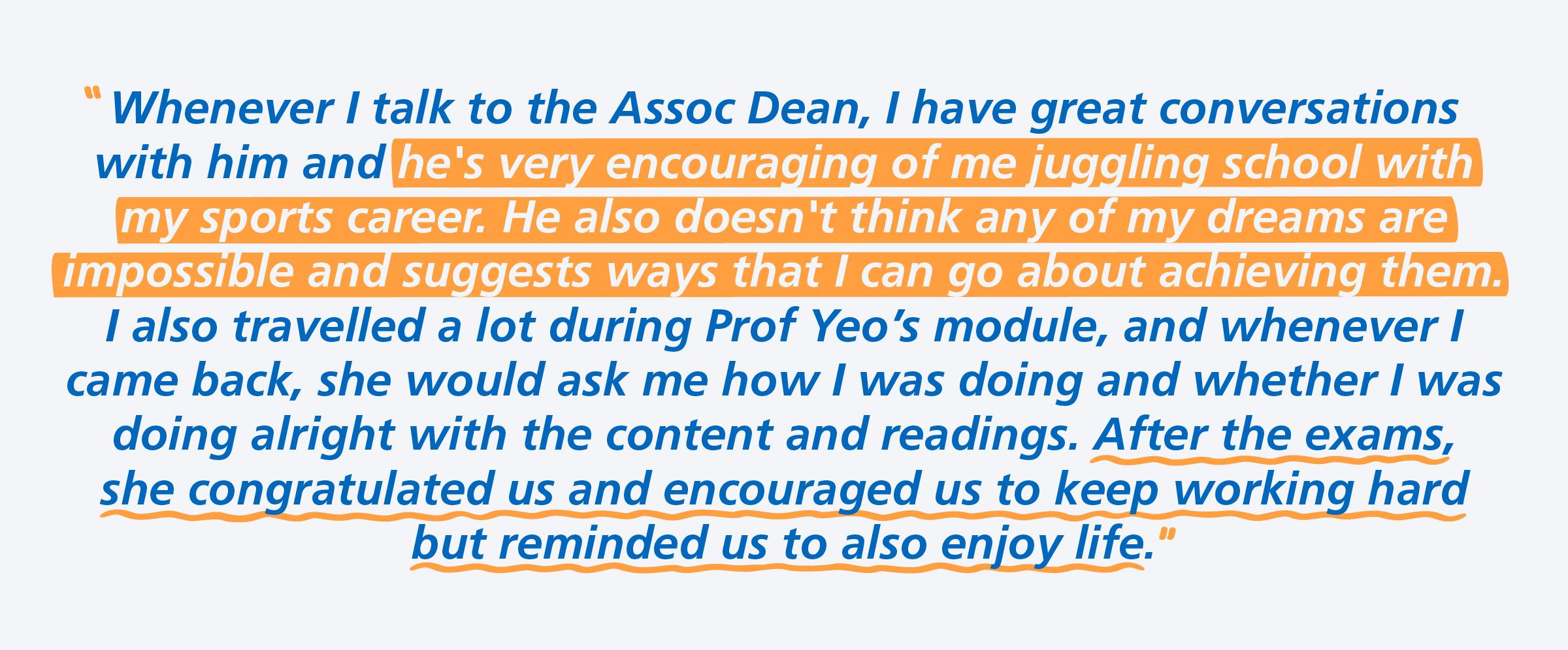 Often overseas competing on the international circuit, Marsha credits the support of the faculty members — such as Associate Professor Yeo Hwee Ying and Associate Dean (Student Affairs) and Senior Lecturer Justin Jerzy Tan — for her ability to manage her workload amidst a demanding schedule. “All professors are very approachable and proactive in offering help to me whenever I am overseas. Some of them even recorded the seminars for me to rewatch later on, which was extremely helpful in my first two years in NUS Law.”