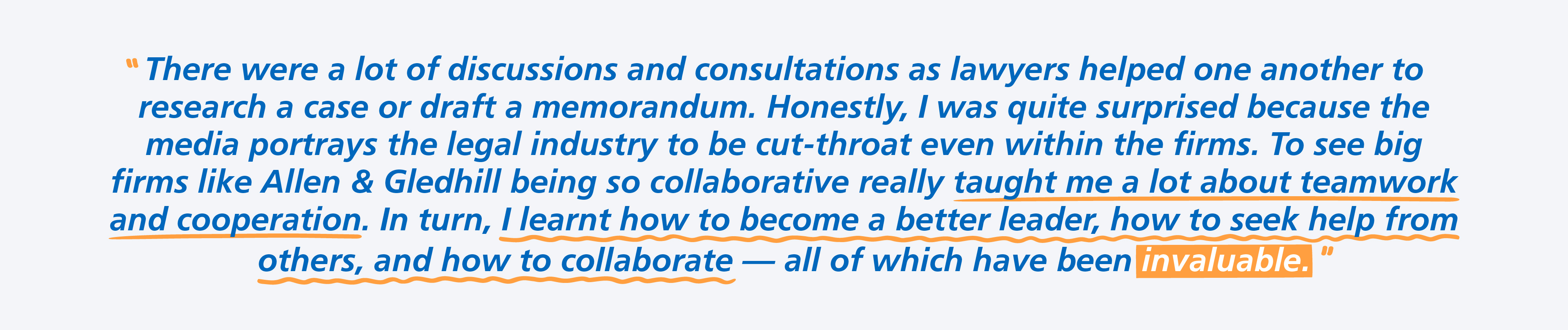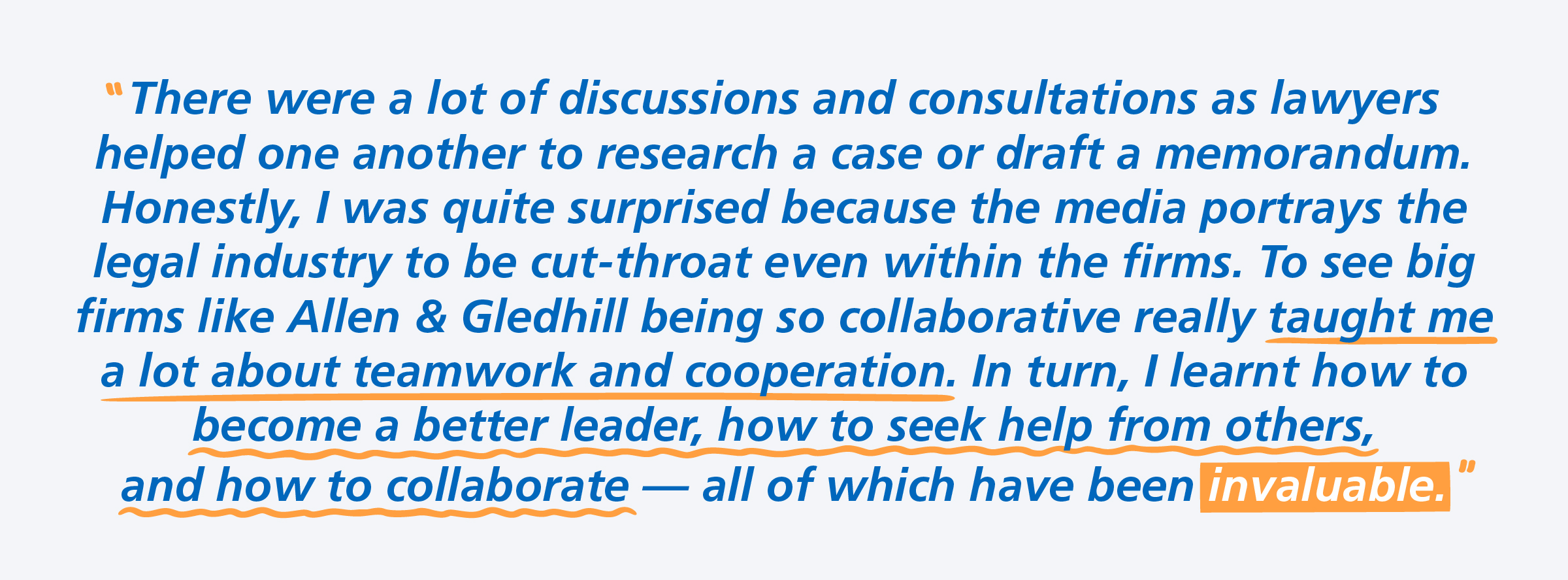 Besides honing her softer skills of collaboration, her second internship also imparted to Marsha hard skills like drafting statements of claims in her personal voice and style without blindly following a template. With the skilful guidance and feedback from her mentor, Marsha learnt to become more confident about the kind of lawyer she wants to be, and the direction she is moving in.