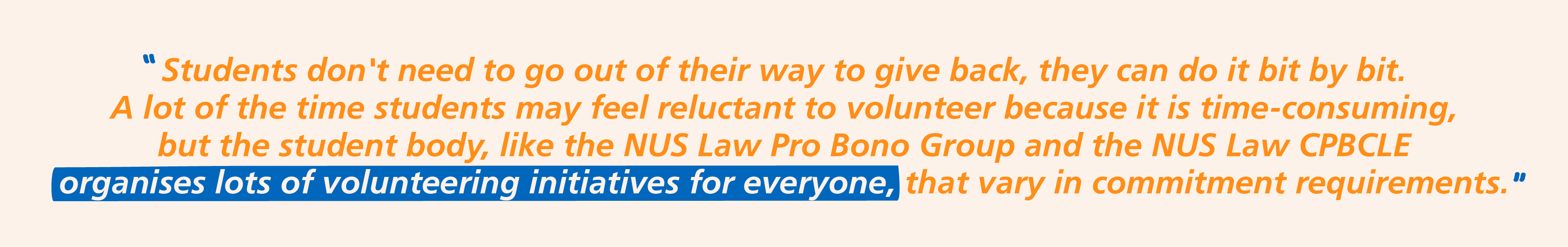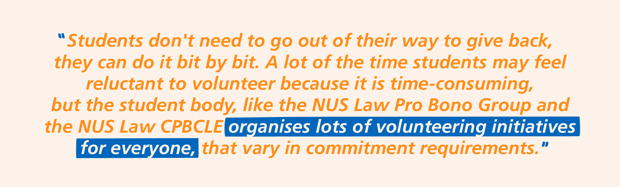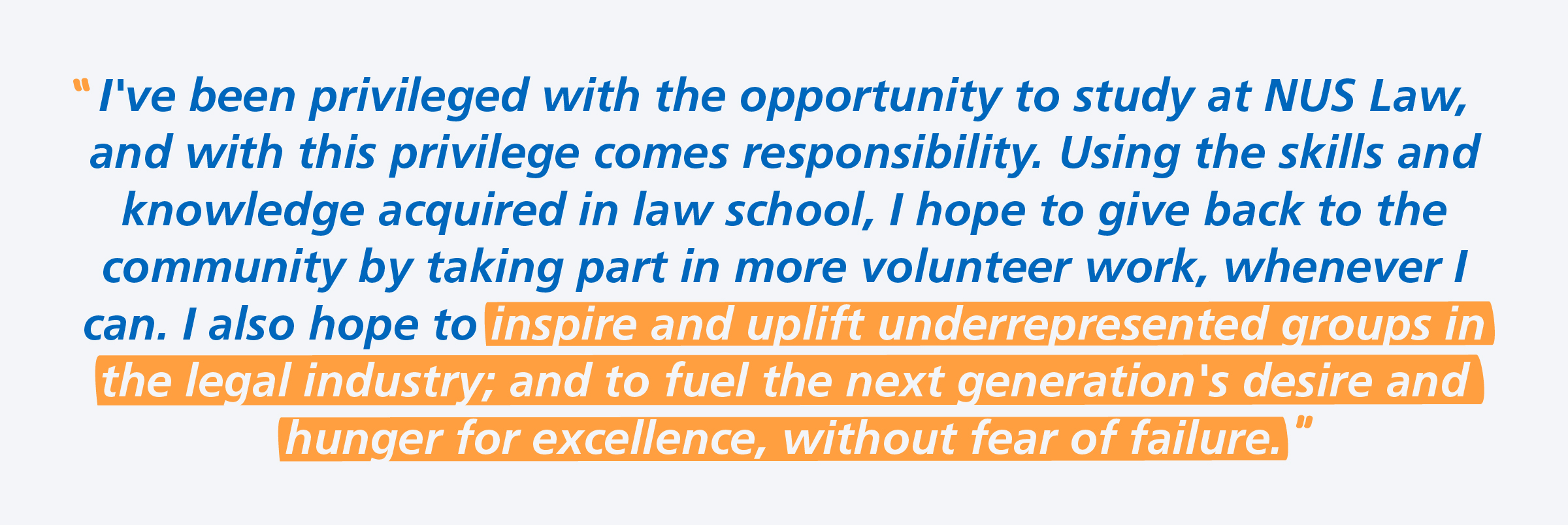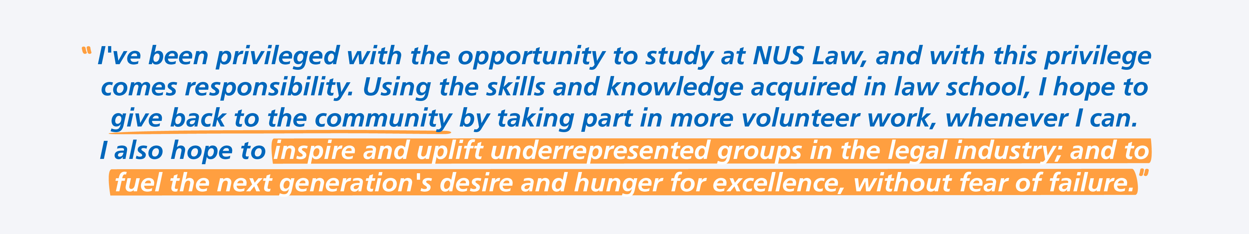 Marsha has also worked extensively with the NUS Law Centre for Pro Bono and Clinical Legal Education (CPBCLE) since entering NUS Law, including working with a youth society that conducts mediation with troubled youths as well as being a part of Foreign Domestic Worker Association for Social Support and Training (FAST) which educated domestic helpers about their employment rights and entitlements.