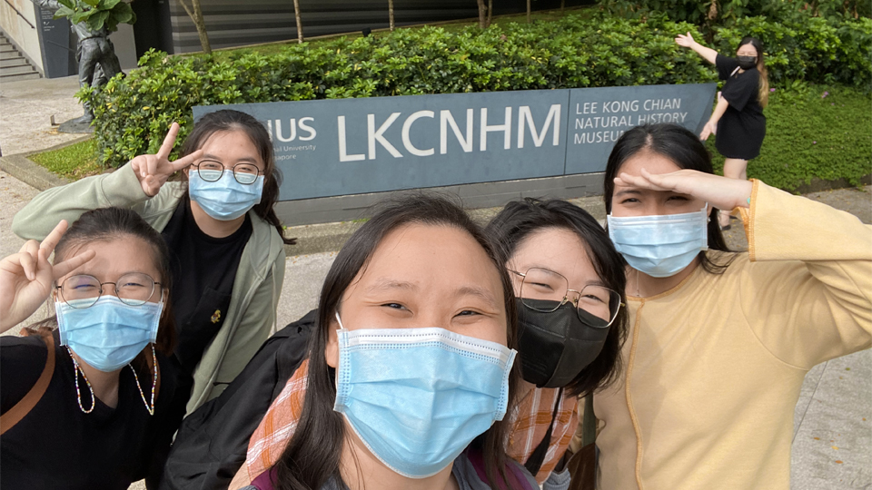 Apple (centre) and her Nursing friends enjoying a post-exam trip to the Lee Kong Chian Natural History Museum.
