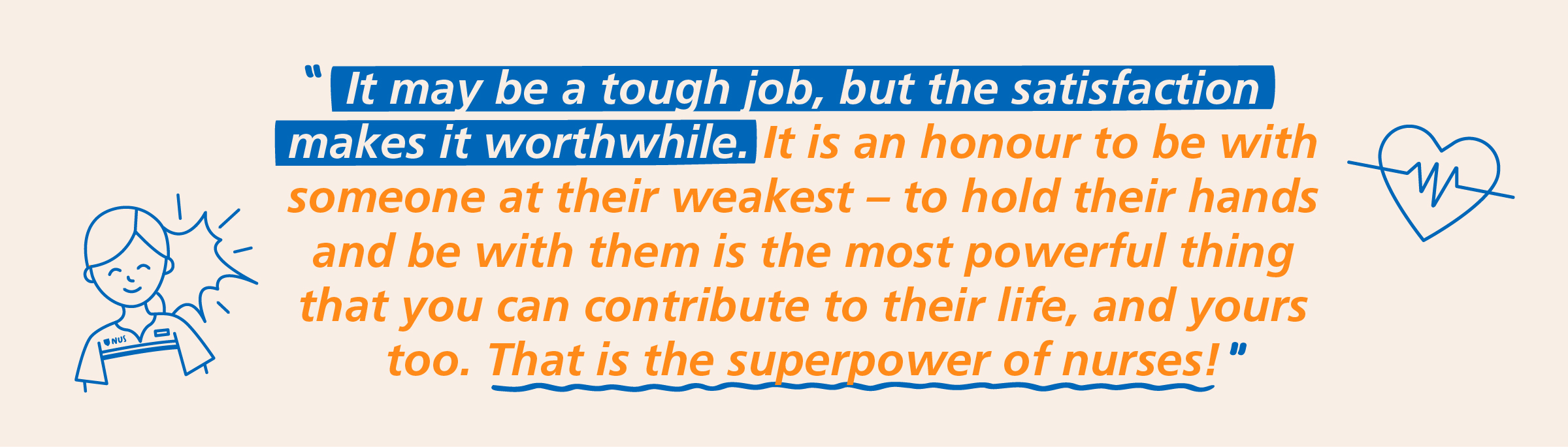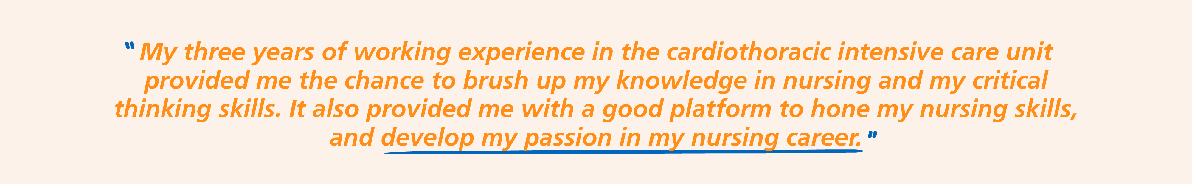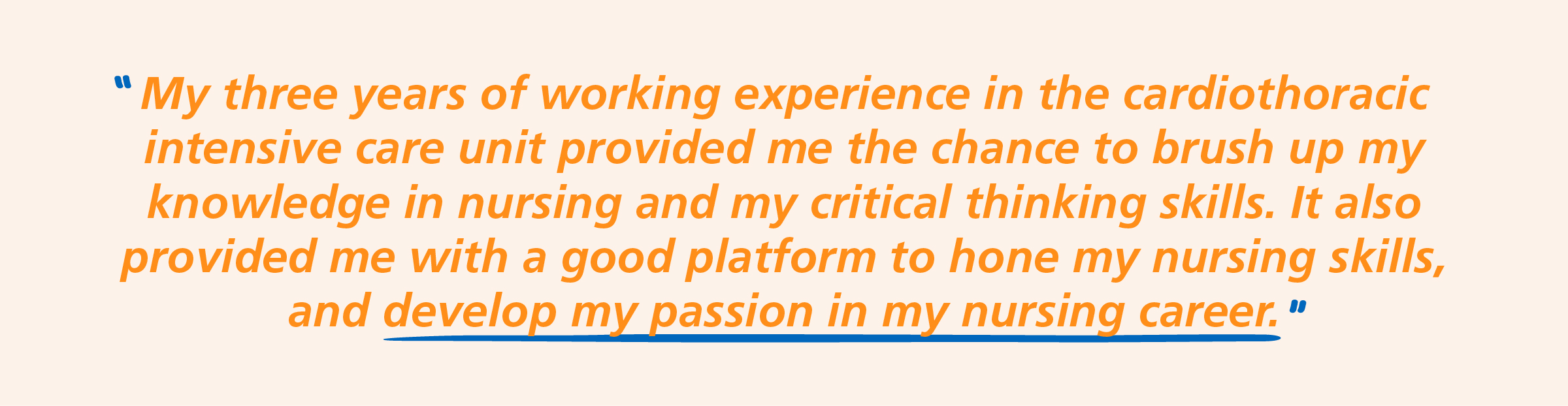 After graduating with a Diploma in Nursing with Merit in 2018, Apple then worked in the National Heart Centre Singapore’s ICU as a Staff Nurse for two years and seven months before enrolling in NUS. While others might regard these events as career detours, Apple sees how all her prior experiences have converged to stand her in good stead in her tertiary nursing education at NUS.