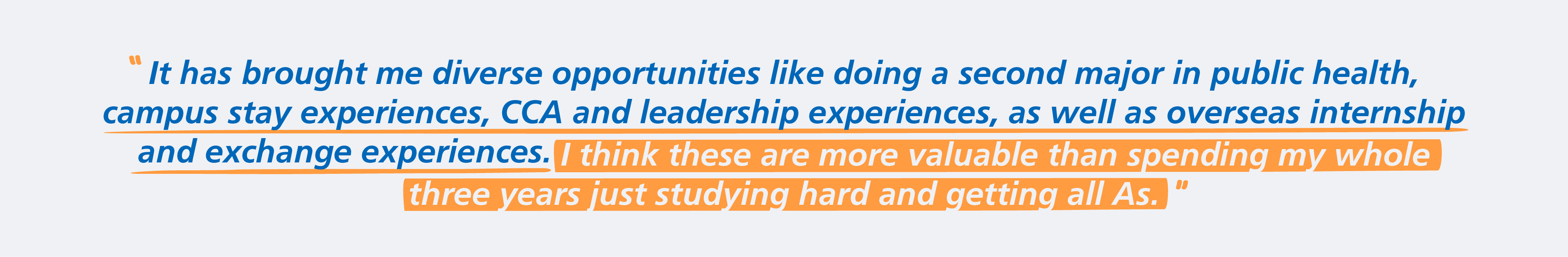 Determined not to tread the same path at NUS, Apple consciously pursued a more well-balanced university experience, immersing herself in the many rich aspects of school life whilst learning to be more forgiving towards herself and others.