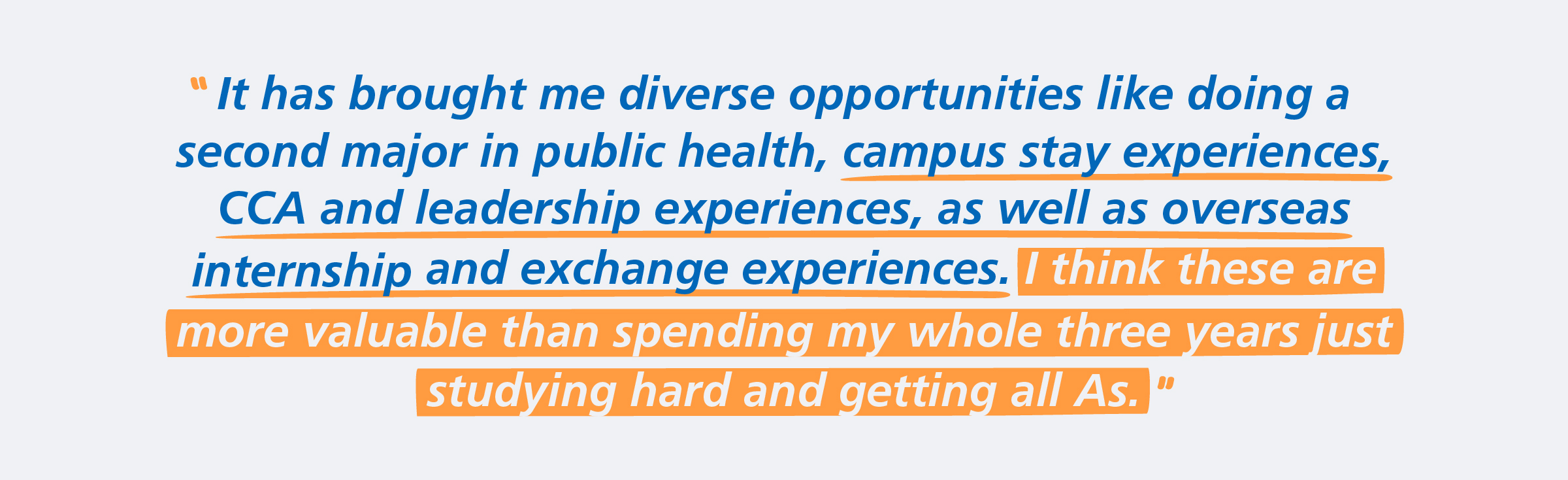 Under the support and positive encouragement of her NUS Nursing professors, Apple was given the chance to pursue a second major in public health to hone her leadership skills and widen her perspectives on health through an overseas internship and summer programme. “Even as NUS has provided me with countless opportunities to develop myself into a better nurse, I hope to also apply my knowledge in both nursing and public health to my dream of improving healthcare and quality of life for everyone,” she shares.
