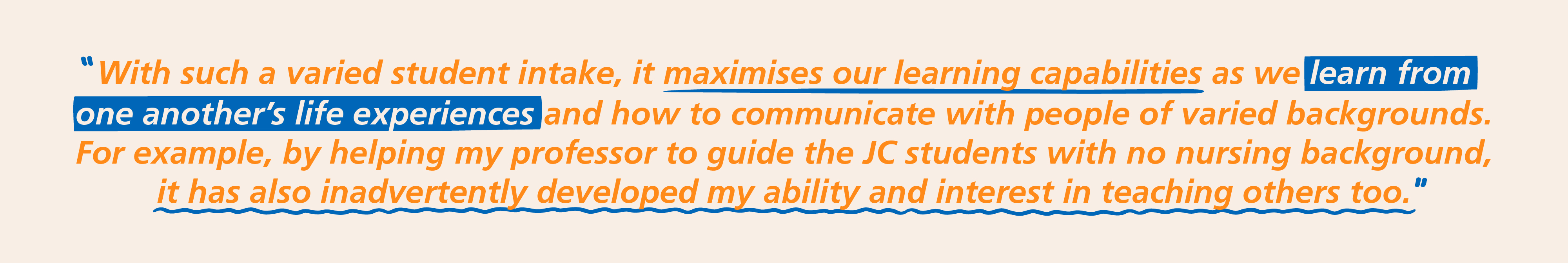 Working as a Staff Nurse during the COVID-19 pandemic enhanced her understanding of epidemiology, infection control policies, and the on-the-ground realities related to her Public Health major. Meanwhile, her nursing stint between her Polytechnic diploma and NUS degree strengthened her nursing skills.