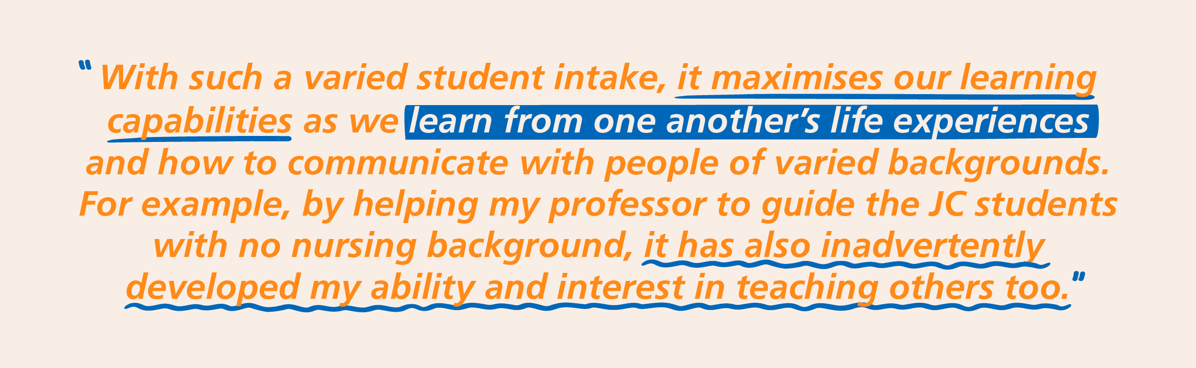 Describing the culture of NUS Nursing, Apple sums it up in one word: diverse. She enjoyed the fact that there were students coming from a whole gamut of educational backgrounds ranging from junior colleges and polytechnics to mid-career switchers.
