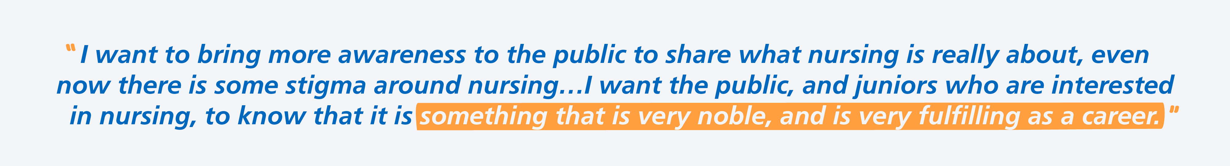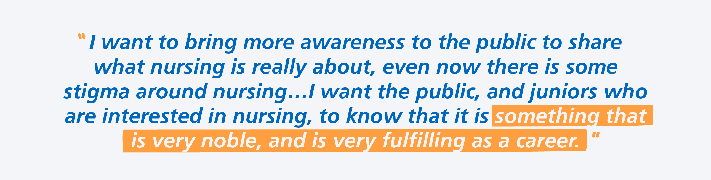 Driven by her personal passion for nursing and her experiences at NUS, Apple decided to sign up as a student ambassador for NUS Nursing. In this role, she participates in outreach programmes to educate the public about nursing and encourage those interested to consider a career in this enriching field.