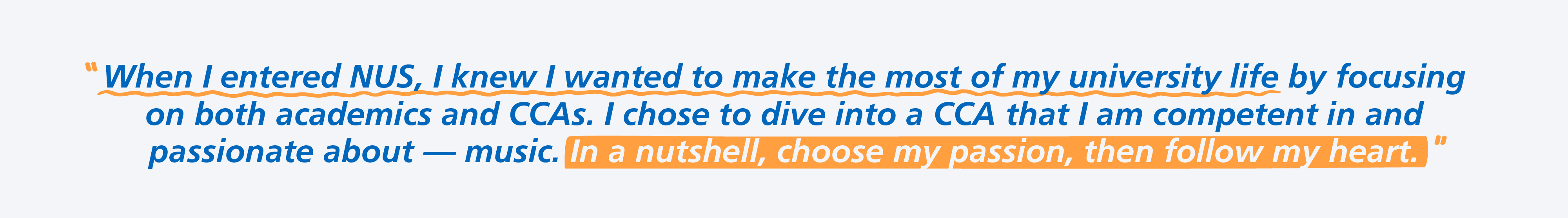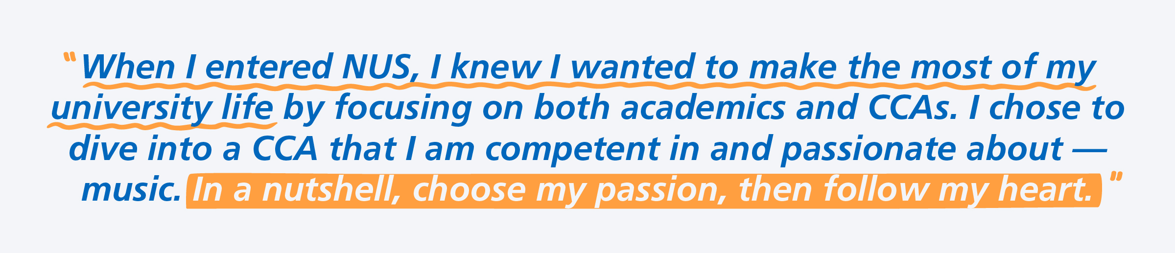 The former resident at KE7 Hall also wore multiple hats, taking up leadership positions in various hall co-curricular activities (CCAs), including Music Director of KE7’s music ensemble group, KEnsemble, as well as KE7’s Cultural Director, helming all performance-related CCAs at the hall.