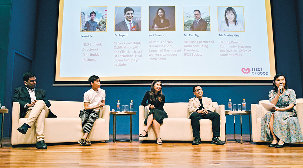 The panel discussion featured (from left) ophthalmologist and philanthropist Dr Rupesh Agrawal; Year 2 NUS Sociology student Mr Jason Lee, who created and directed The Buddy, one of the films from 15 Shorts; Ms Kari Tamura; consultant Mr Alan Ng; and moderator Ms Corrine Ong (Business ’94), NUS Student Affairs’ Deputy Director of Community Engagement.