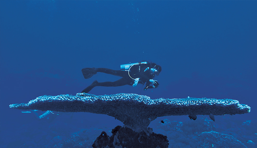 Dr Neo pictured with a large Acropora coral table, when on a diving trip to Apo Island in the Philippines in 2013.