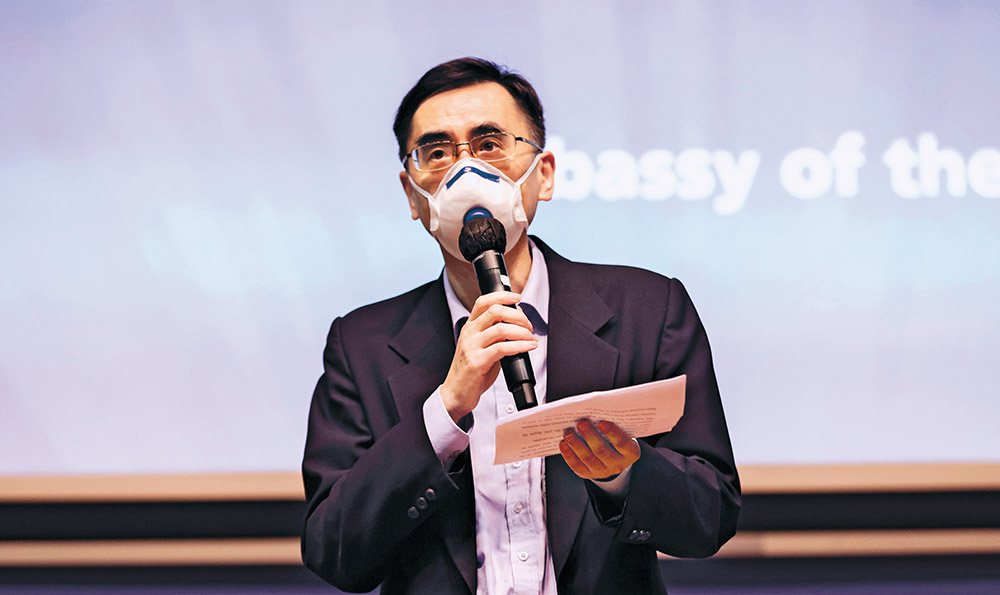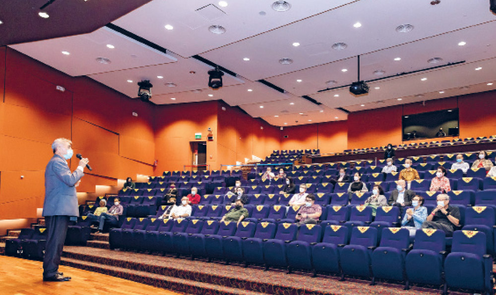 Mr Bernard Toh, Director of NUS Alumni Relations, speaking to a scaled-down audience (in line with safe distancing measures within the auditorium), where he thanked the Embassy and the Singapore China Friendship Association for their partnership.