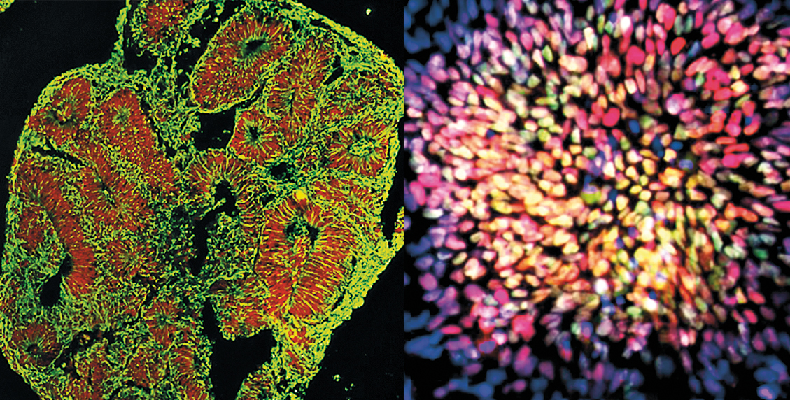 Images of neural rosettes in organoid (left) and floorplate progenitor cells (right), both found within the spinal column.