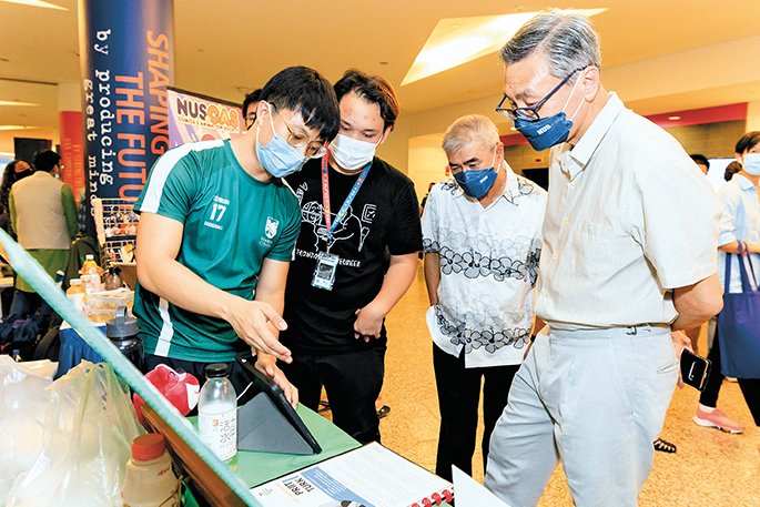 Prof Tan and Mr Bernard Toh (Architecture ’84), Director of NUS Alumni Relations, at one of the booths set up at UTown.