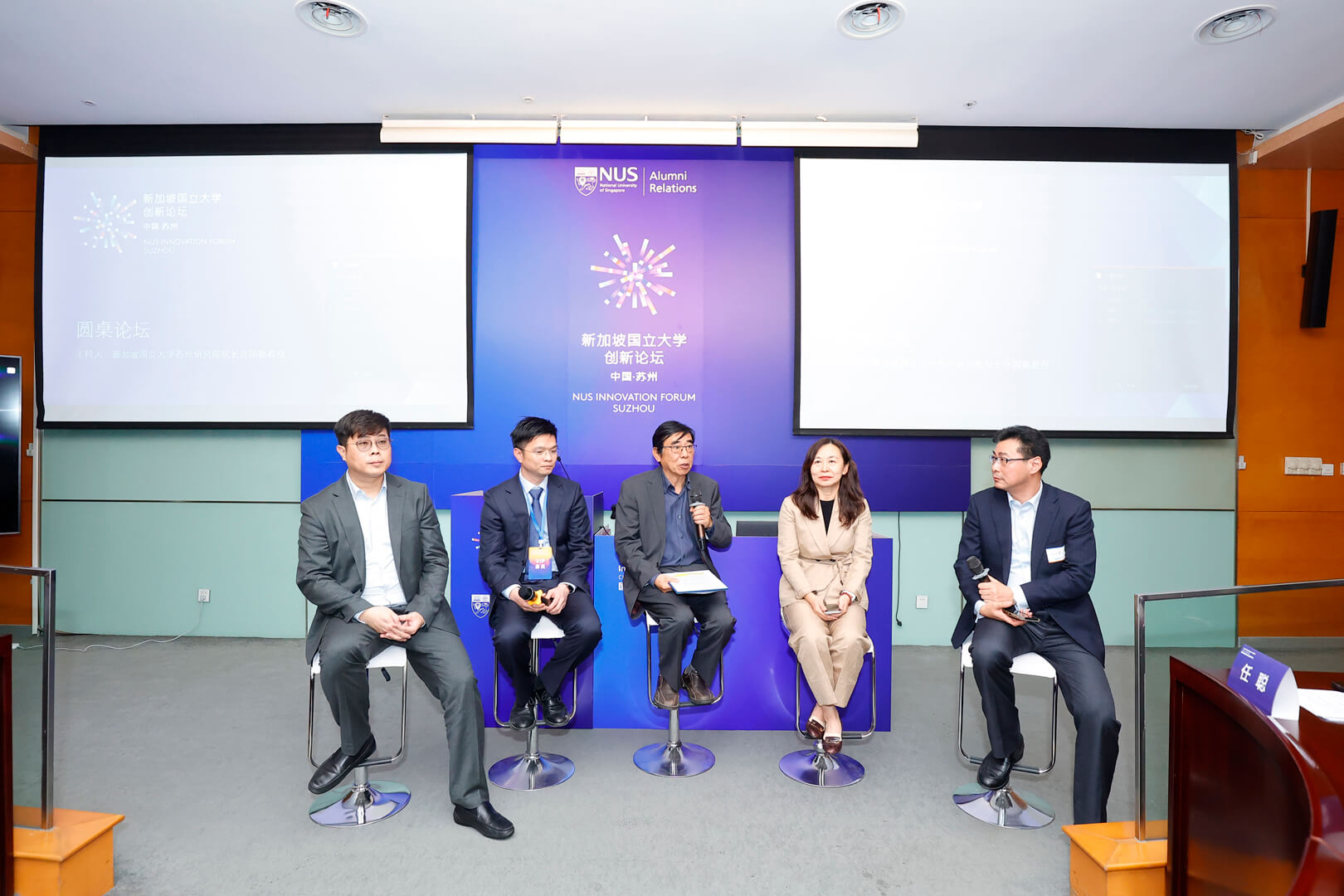 Amid warm applause and anticipation, the alumni roundtable forum was then chaired by Professor Xu Guoqin, Director of NUSRI. Closely following the topic of "China's Industrial Trends: Cutting-edge Technology Development", four alumni participated in the session, Dr You Mingliang, Ms Xie Yu, Mr Jesse Li Shu and Mr Yao Haisong.