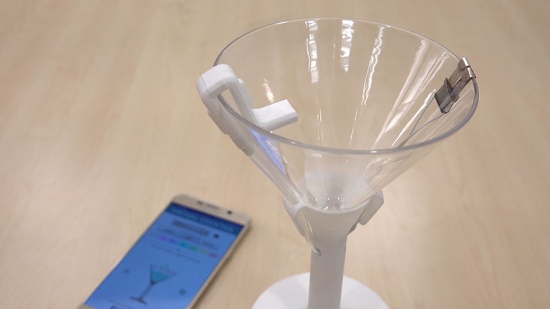 Virtual Cocktail’s novelty lies in its ability to switch between taste modes (salty, bitter, sour) and aromas (three chambers), allowing users to explore and experimentally create new flavors. The device can be remotely controlled via smartphone through Bluetooth connection, enabling users to create multiple combinations.