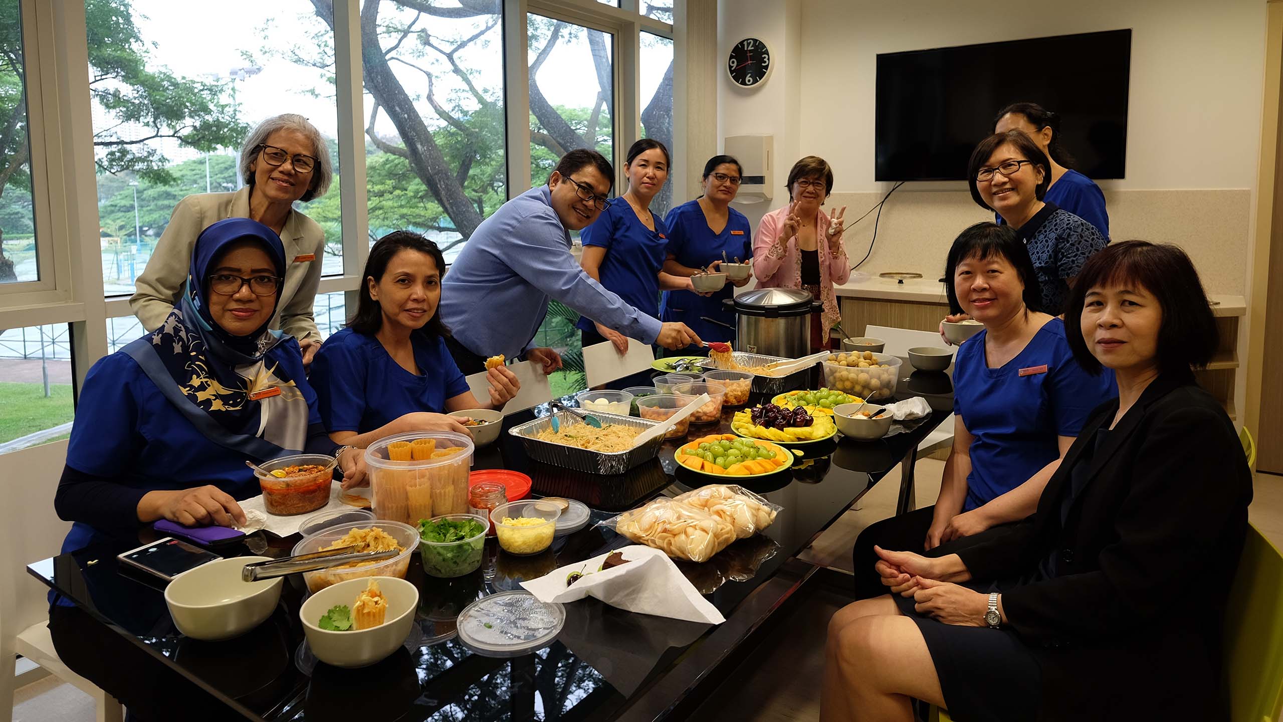 Dr Chua (in peach kebaya) hosting her colleagues to her famous mee siam and other delights on Nurses' Day