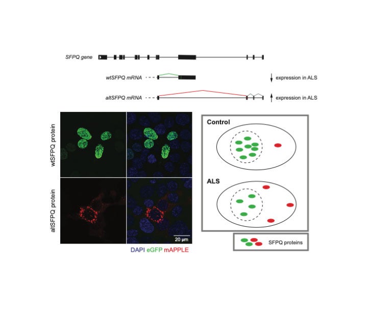 Crucially, we show in various ALS models that there is a shift in SFPQ usage / production away from the regular form, and towards this new ‘alternative’ version of SFPQ, therefore providing a potential explanation for the abnormal location of SFPQ observed in ALS patient tissues. Further still, we characterise the behaviour and function of this novel protein, providing greater insight into its potential importance in ALS-affected cells. Altogether, our study provides a new and targetable mechanism for the correction of SFPQ levels / localisation, which may alleviate some of the negative downstream consequences for RNA molecules, and ultimately damage to nerve cells in ALS.