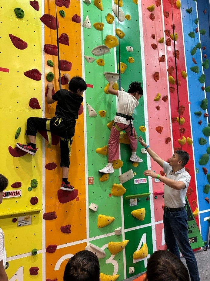After the safety briefing, the children wasted no time getting started. The volunteers assisted wherever we could, helping the kids secure their harnesses, adjusting ropes, and offering words of encouragement. The first few attempts were challenging for most of them; many slipped off the wall or hesitated midway, but it was inspiring to watch them persevere. With each try, they climbed higher, learning to trust both their own strength and the supportive cheers from their friends and us volunteers. Some of the younger ones displayed remarkable courage. Despite their initial fear, they refused to give up. With steady encouragement, they were all able to complete their climbs and reach the top. Soon, the kids began inviting us volunteers to join in and what followed were friendly races up the climbing walls. The gym echoed with cheers and laughter as each child celebrated their own little victories. For an hour and a half, time seemed to fly by. By the time our session ended, many of the children were still asking if they could stay longer.