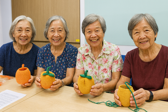 Valerie CHUA, Seniors proudly presenting the crochet pieces they created during the activity session. AI generated (ChatGPT).