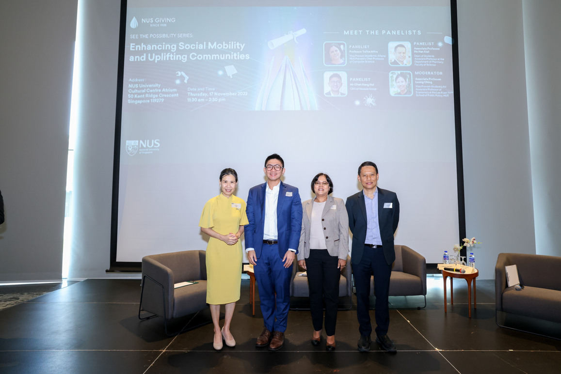 The See the Possibility Campaign was launched on 17 November 2022, at a special event that allowed donors and guests, along with members of the National University of Singapore (NUS) community, a platform for an open exchange of ideas that illuminate the understanding of pertinent issues today. The panelists included Professor Tulika Mitra, Vice Provost (Academic Affairs) and NUS Provost’s Chair Professor of Computer Science, Associate Professor Ho Han Kiat, Dean of Students and Associate Professor at the Department of Pharmacy, Faculty of Science, Mr Chen Heng Hui, Chief Executive Officer of Neoasia Group, and moderator Associate Professor Leong Ching, Vice Provost (Student Life) and Associate Professor of Economics at the Lee Kuan Yew School of Public Policy.