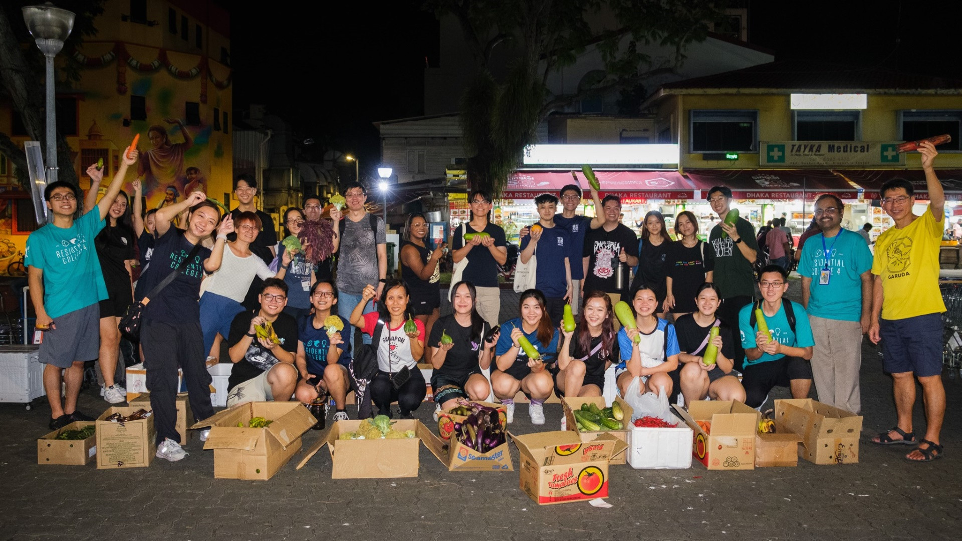 RC4 students and staff at the RC4 Veggie Rescue, led by Fellow Associate Professor Tan Lai Yong (first from right, in yellow), where they partnered with other community volunteers to tackle the issue of food wastage.The RC also dedicated time to serving the community through the RC4 Veggie Rescue. Staff, students and alumni came together to gather leftover fresh produce, which would have otherwise been discarded by grocery stores, to be redistributed amongst needy households and communities.