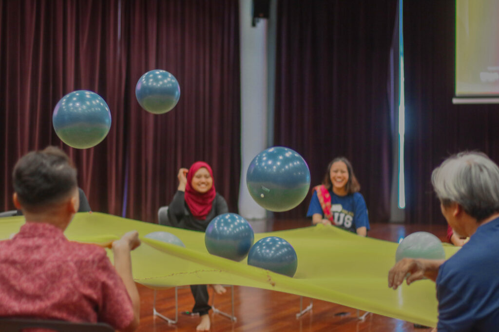 Mr Edwin started with warm up and stretching that trains the participants’ mobility, before he led them through a set of coordination and focus activities. To promote fast reflex and make participants open up to one another, Mr Edwin had them pass several balls around (either to the left or the right) while he threw a different coloured ball to disrupt the flow. He then organised a net game whereby participants had to ensure at least one ball remained on the net while he attempted to push them off-course throughout the song. Throughout the activities, Mr Edwin maintained high levels of energy and used upbeat songs to ensure that the participants were kept energised and active in trying to coordinate with the movements of the balls.