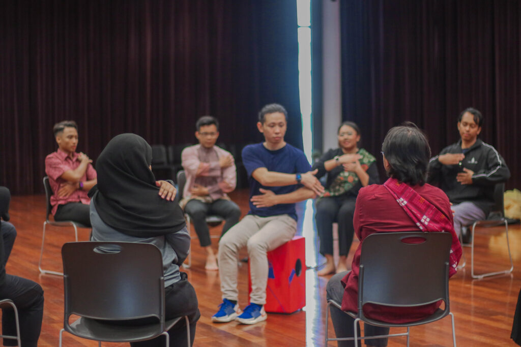In exploring how elements of Malay dance and music could be employed in such activities, Mr Osman introduced the participants to the beats of typical Inang and Joget music. Mr Edwin observed that half-beats may be common in the Joget music, that may not be obvious should this be employed for a session with seniors. To that, Mr Osman deconstructed the Joget music to highlight its base form, slowly adding on to it to increase the difficulty level.
