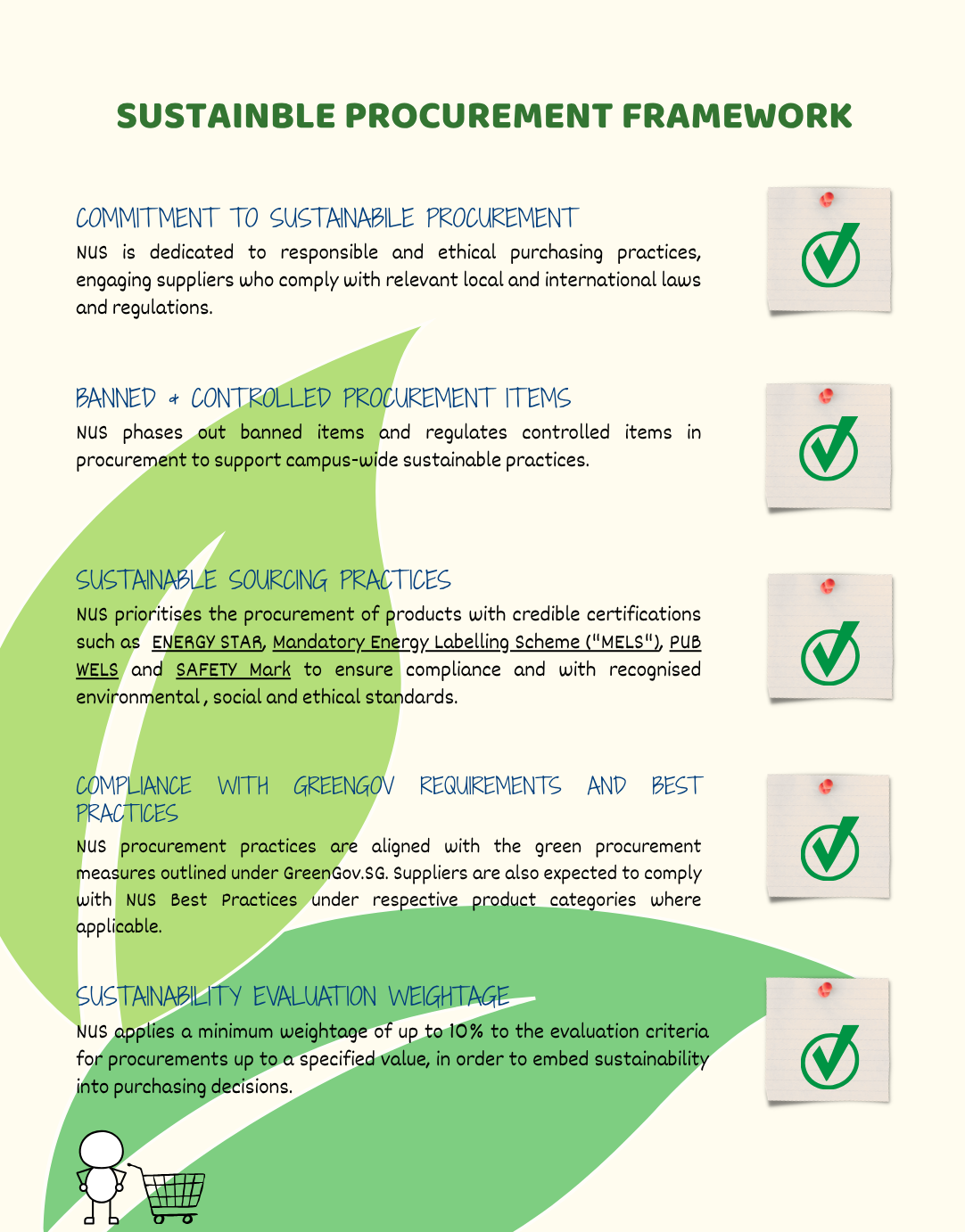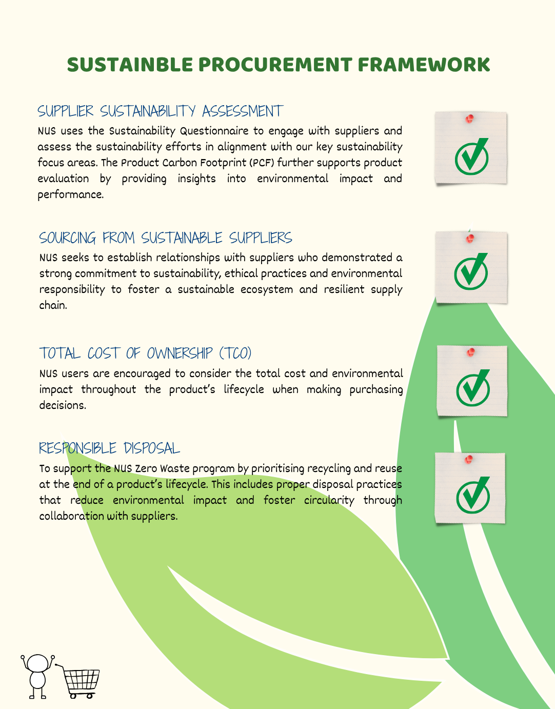 The Sustainable Procurement Framework ("SPF") provides a structured and systematic approach to embedding sustainability into supplier and product evaluations. It enables informed purchasing decisions and supports continuous monitoring of our suppliers’ sustainability performance. Below are the key highlights of the SPF, which reflect NUS’ commitment to sustainable procurement: